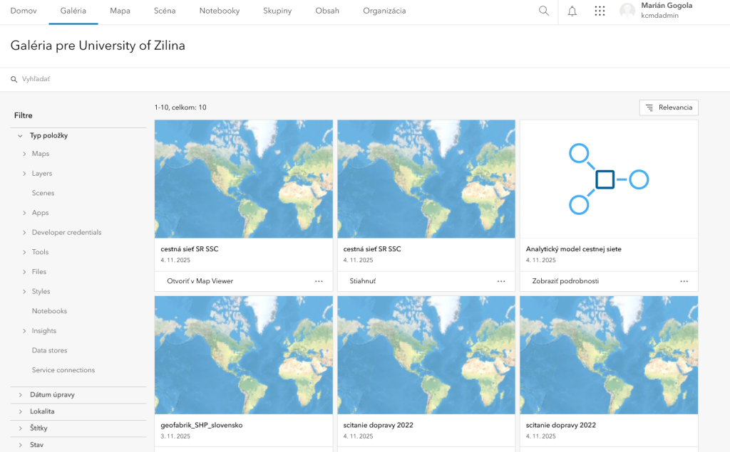 Každý používateľ má svoj ArcGIS účet, kde má uložený svoj „Obsah“ – mapy, dáta, vrstvy, aplikácie a projekty.