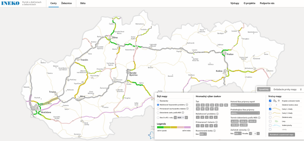 Príklad použitia dát pri hodnotení potrebnej dopravnej infraštruktúry prinášal portál INEKO: https://doprava.ineko.sk/mapa/cesty.